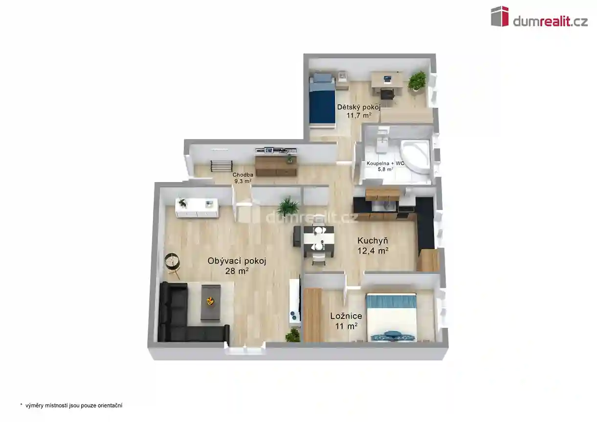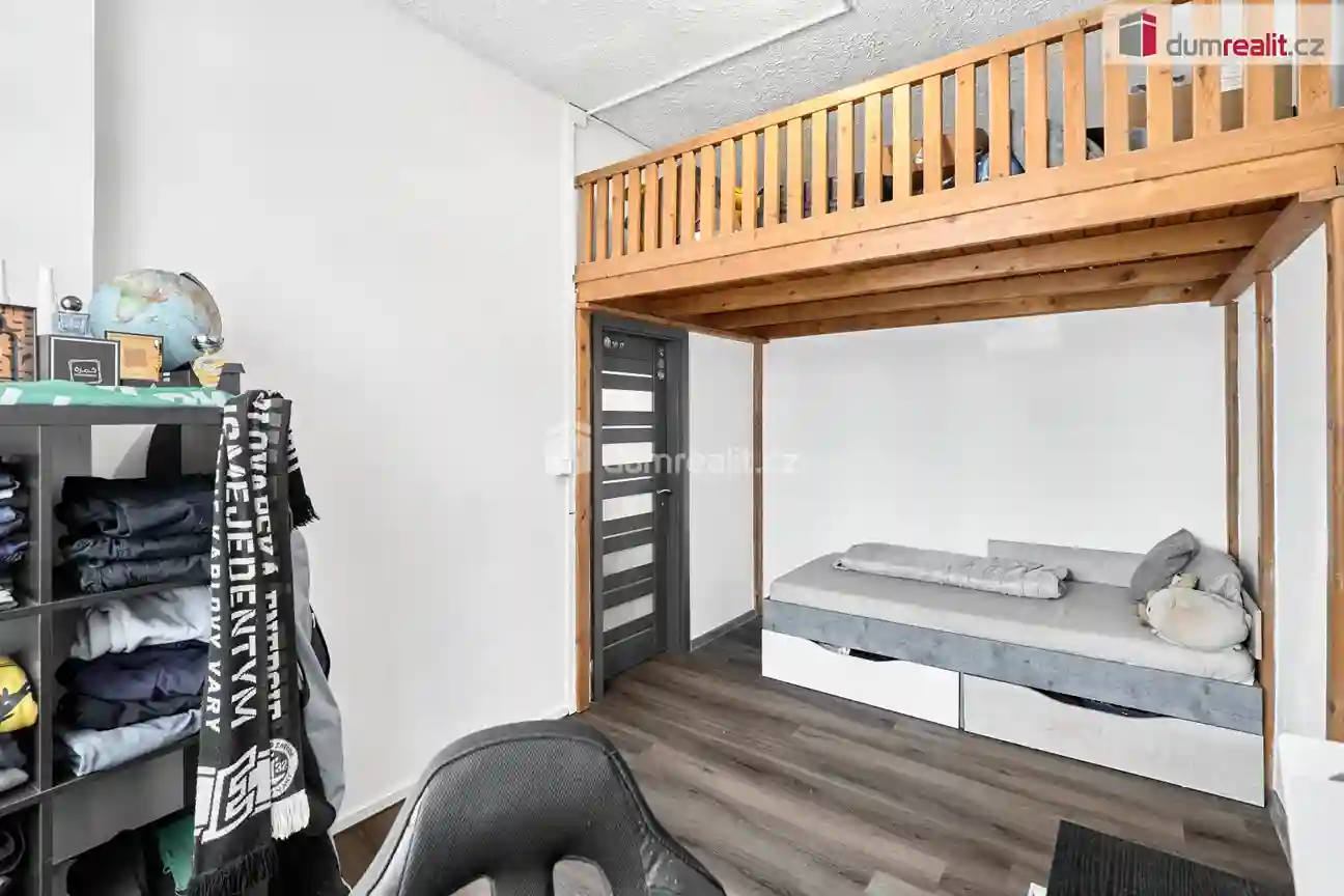 Dominantou bytu je prostorný obývací pokoj s funkčním krbem na dřevo, který nejen vytváří příjemnou atmosféru, ale zároveň dokáže bez problémů vytopit celou místnost. Díky tomu působí byt velmi útulně a nabízí příjemné prostředí pro rodinné bydlení. V dětském pokoji je navíc prakticky řešený prostor s dřevěnou patrovou postelí na míru, což umožňuje efektivní využití prostoru.