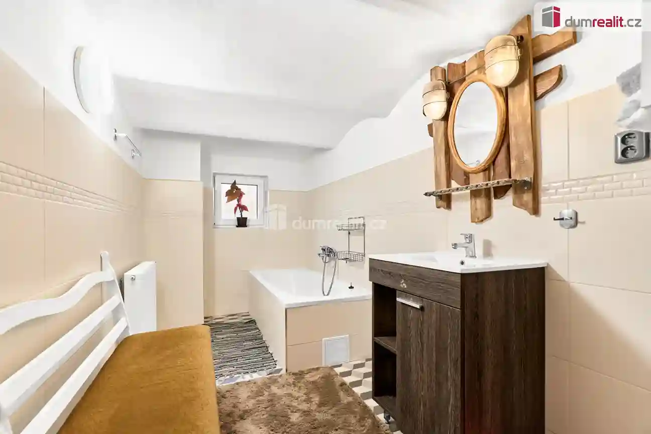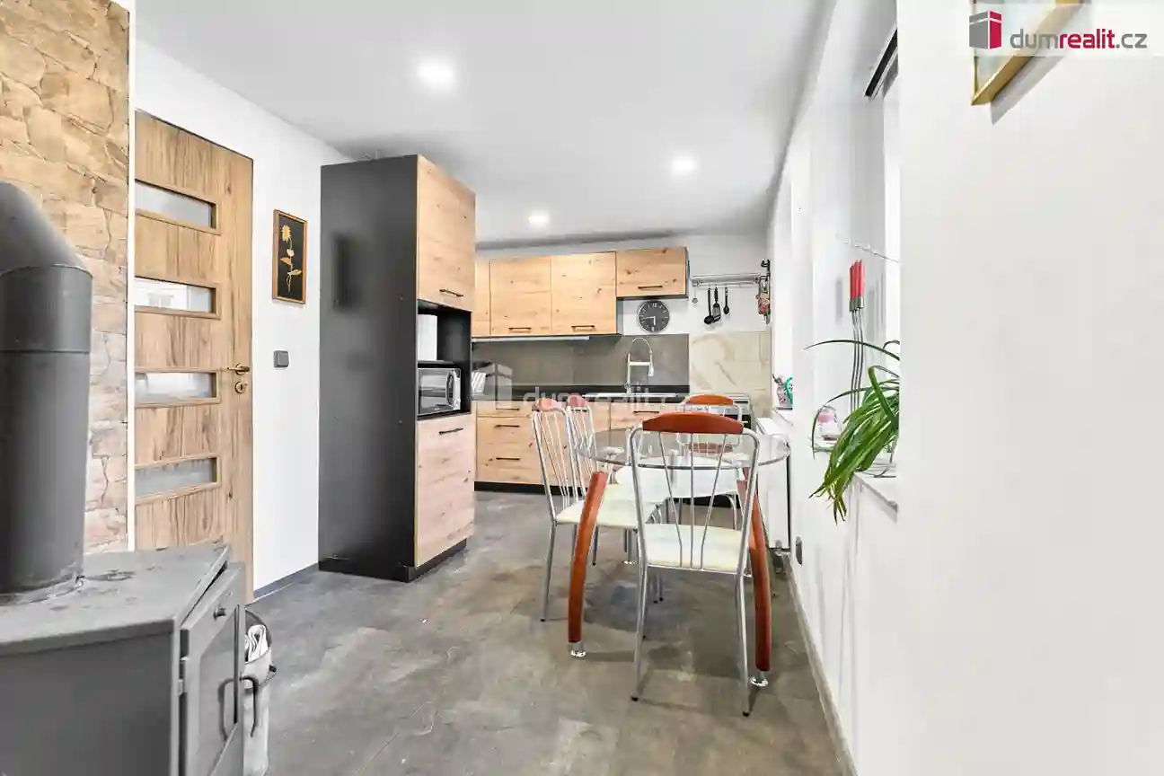 Dům je připravený k okamžitému nastěhování a nabízí praktickou dispozici vhodnou pro rodinné bydlení. V přízemí se nachází prostorný obývací pokoj, kuchyň s jídelnou, koupelna s WC a technická místnost. Součástí přízemí je také vstup do sklepa a garáže, která je přístupná přímo z domu, což zajišťuje pohodlné každodenní využívání.