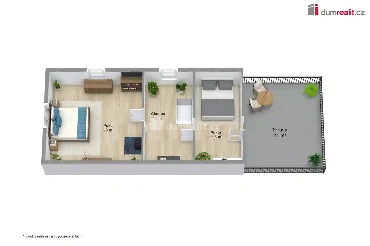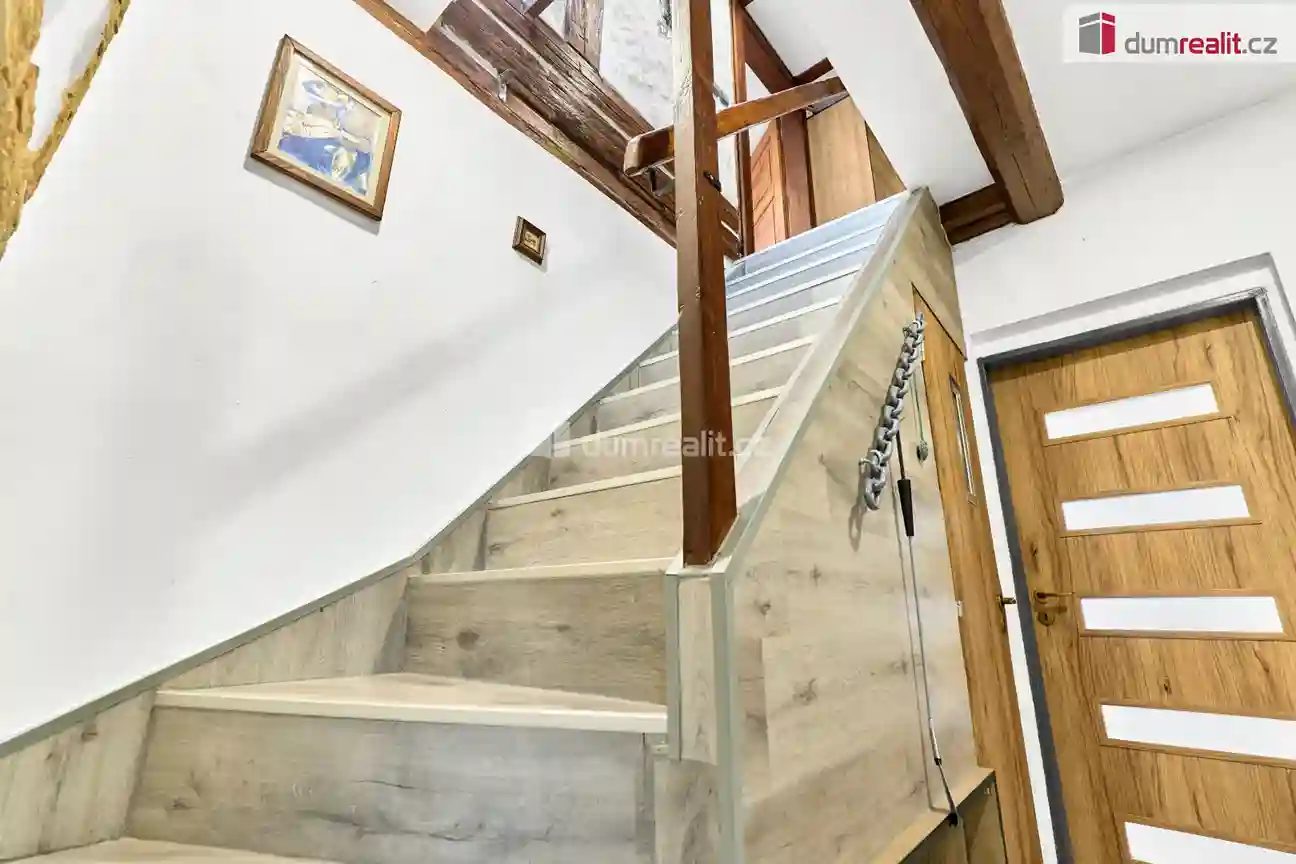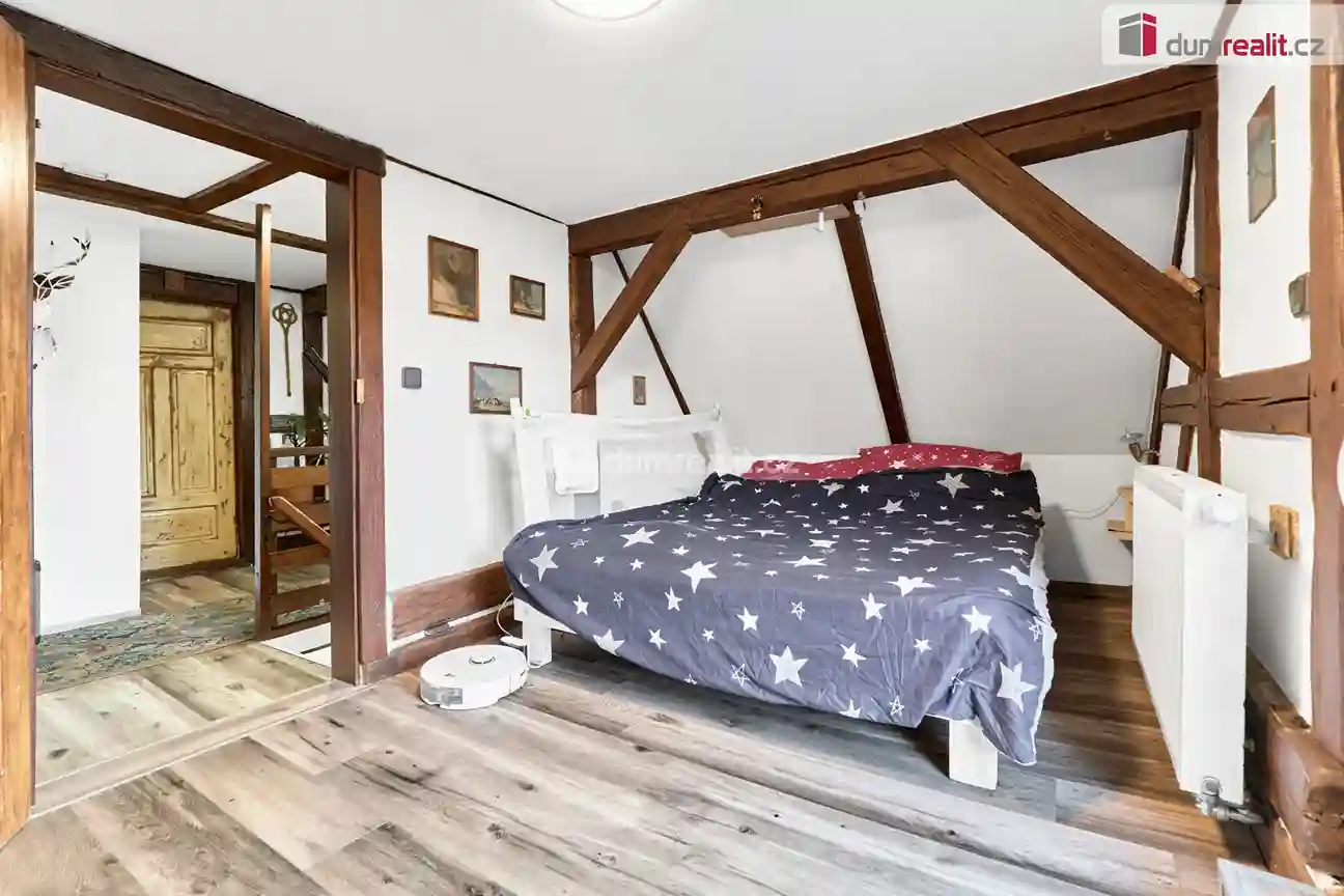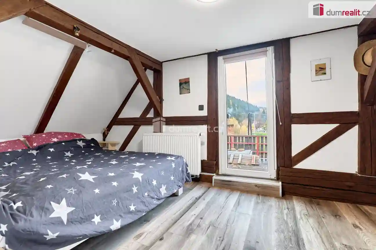 V prvním patře se nachází ložnice a dětský pokoj se vstupem na terasu. Ta je připravena k dokončení podle představ nového majitele a nabízí příjemný prostor pro relaxaci s výhledem do okolní přírody. Celková podlahová plocha domu činí 114 m², díky čemuž poskytuje dostatek prostoru pro pohodlné rodinné bydlení.