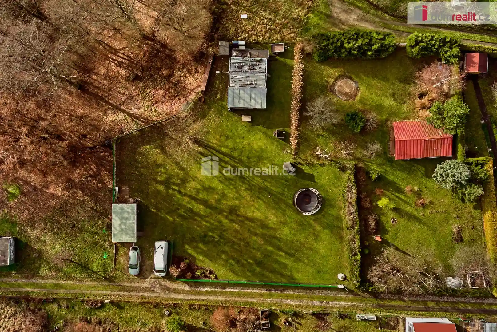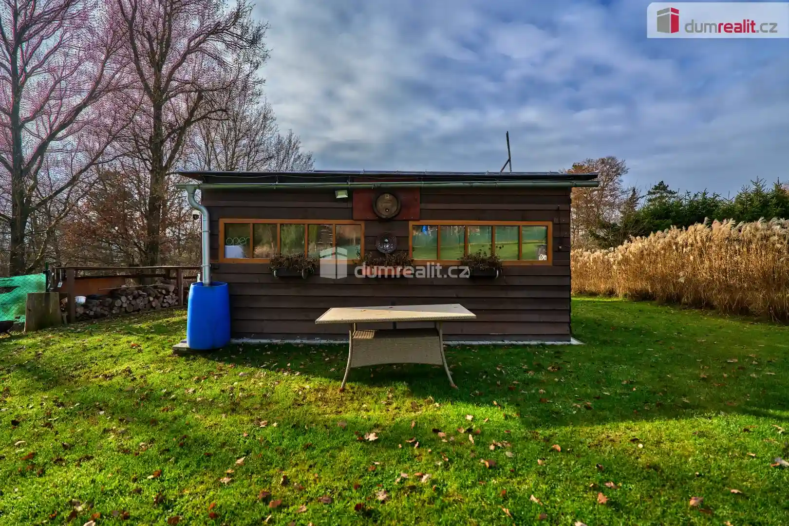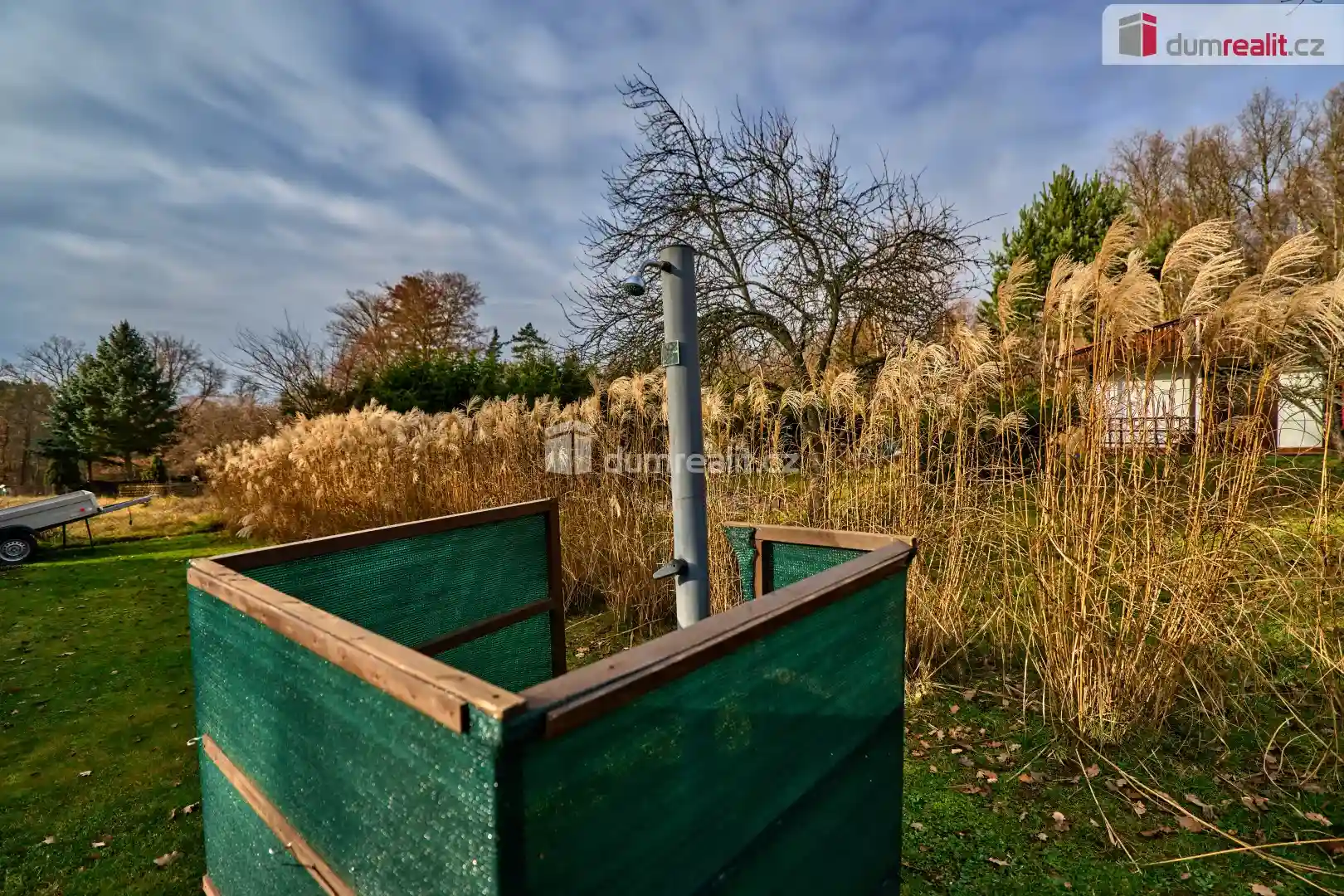Součástí pozemku je navíc moderní modulární domek, který umožňuje okamžité využití nemovitosti. Domek disponuje kuchyní, světlou prosklenou jídelnou a ložnicí, a proto poskytuje praktické a komfortní zázemí pro rekreační pobyty i delší pobyt v přírodě. Vedle domku se zároveň nachází venkovní sprcha a suchá toaleta, což zajišťuje základní komfort při každodenním využívání pozemku.